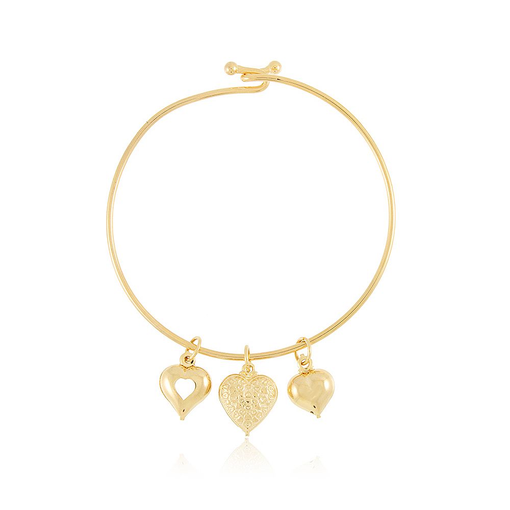 Pulseira Bracelete Banhado Fino com Três Pingentes de Coração Pendurados, liso, vazado e com textura.