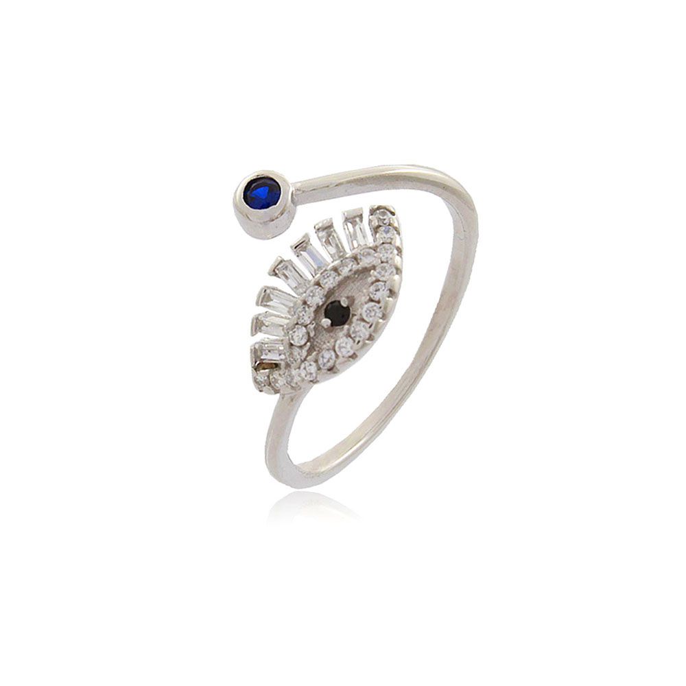 Anel Prata 925 Olho Grego Cravejado Com Zircônias E Na Outa Ponta Um Ponto De Luz Em Zircônia Azul.
