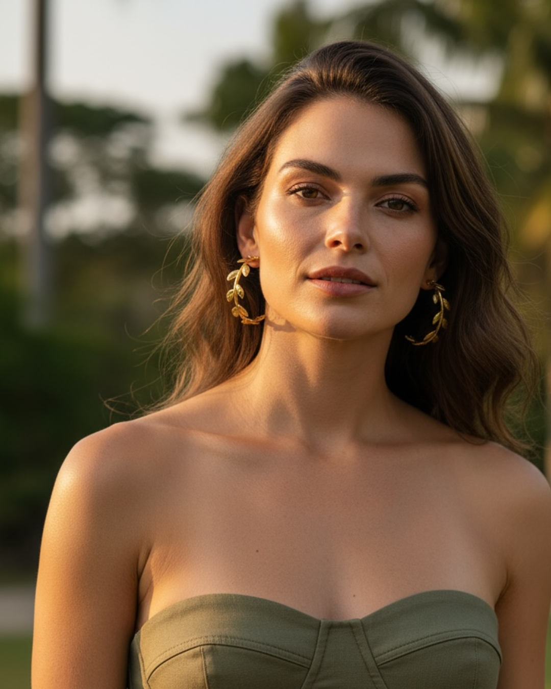 Inspirada na leveza da natureza, essa argola banhada traz folhas lisas com acabamento delicado e design curvado, criando um visual elegante e moderno. Ideal para quem busca uma peça versátil, com presença e fluidez orgânica. Tamanho: 5cm cicurferência | 1cm largura frente