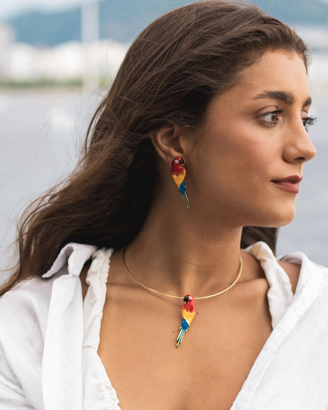 Colorido, imponente e cheio de atitude, o Brinco Arara Tropical traduz o espírito leve e vibrante da fauna brasileira. O design exclusivo combina o brilho do banho em Ouro 18k com o pingente esmaltado em resina italiana de alta qualidade, nas cores intensas vermelho, amarelo e azul. Uma peça que se destaca com elegância e irreverência tropical.
