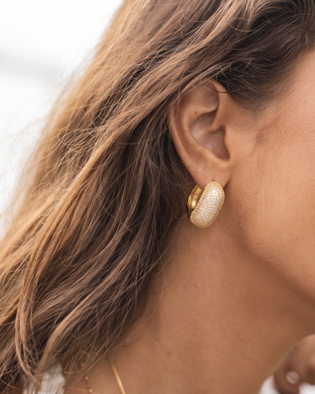 Argola de design contemporâneo em formato de tubo quadrado, totalmente cravejada com micro zircônias que proporcionam brilho intenso e acabamento sofisticado. A peça é estruturada e elegante, banhada a Ouro 18k, ideal para compor produções modernas com destaque e refinamento.