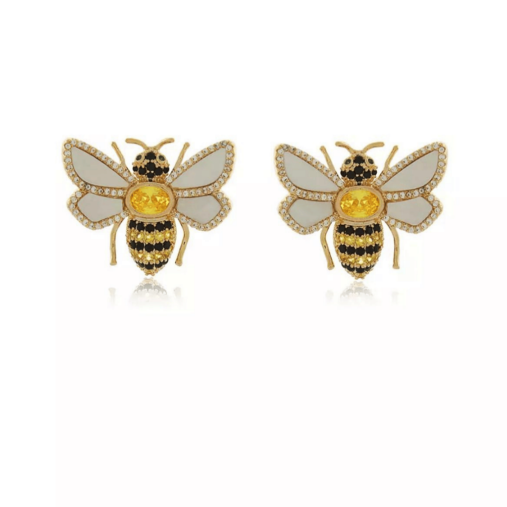 Brinco Banhado Abelha Rainha Cravejada com Zircônia e Cristal Amarelo.