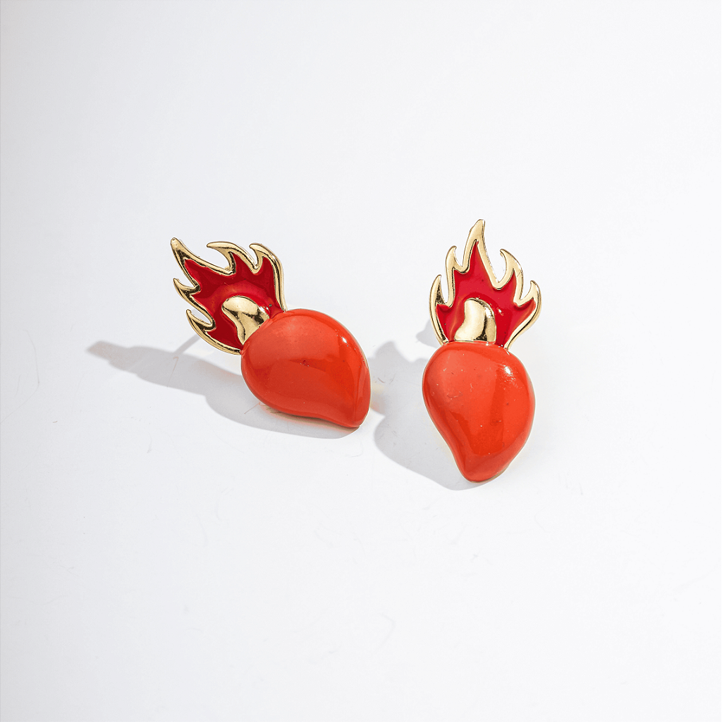 Cheio de personalidade e com alma tropical, esse brinco folheado combina o formato do caju com uma chama estilizada ao fundo, em esmaltação vibrante. Uma peça com mood leve, solar e descolado — perfeita para looks criativos que fogem do óbvio.