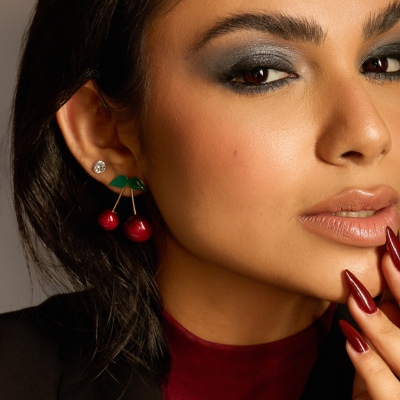 Brinco Banhado Cereja Dupla com folha, com uma belíssima resina em gradiente, dando profundidade e realidade a essa fruta da sensualidade e beleza.