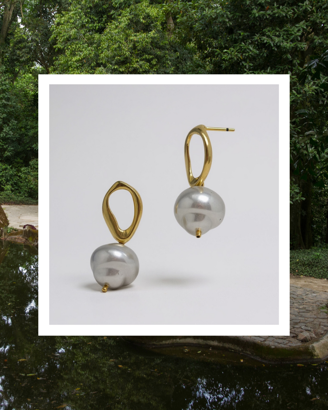 Um equilíbrio entre formas orgânicas e a elegância natural das pérolas. Esse brinco banhado une uma pérola barroca de brilho suave com um aro vazado de design orgânico e acabamento liso. Uma peça autoral e elegante, perfeita para realçar a beleza de qualquer look.
