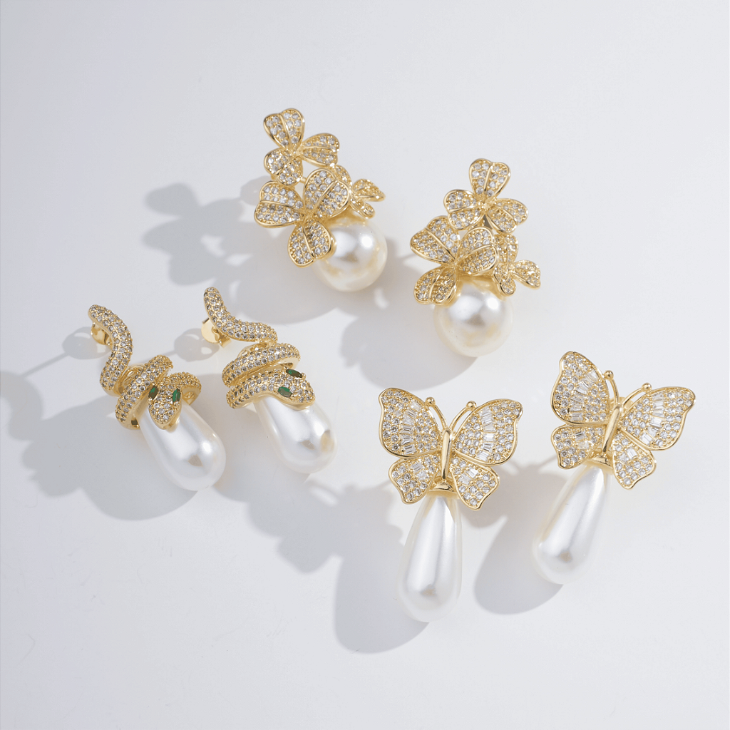 Delicadeza em flor. Esse brinco banhado traz três flores de pétalas abertas, todas cravejadas com zircônias, que desabrocham sobre uma pérola redonda clássica. Uma peça romântica, luminosa e cheia de charme para ocasiões especiais.