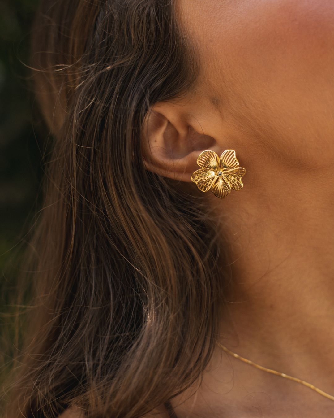 Inspirado na exuberância tropical do hibisco, este brinco apresenta pétalas esculpidas com textura orgânica e acabamento polido que realça o brilho do banho em Ouro 18k. Uma peça elegante e atemporal que traduz delicadeza e presença em um design floral sofisticado, perfeita para compor looks leves, femininos e cheios de personalidade.