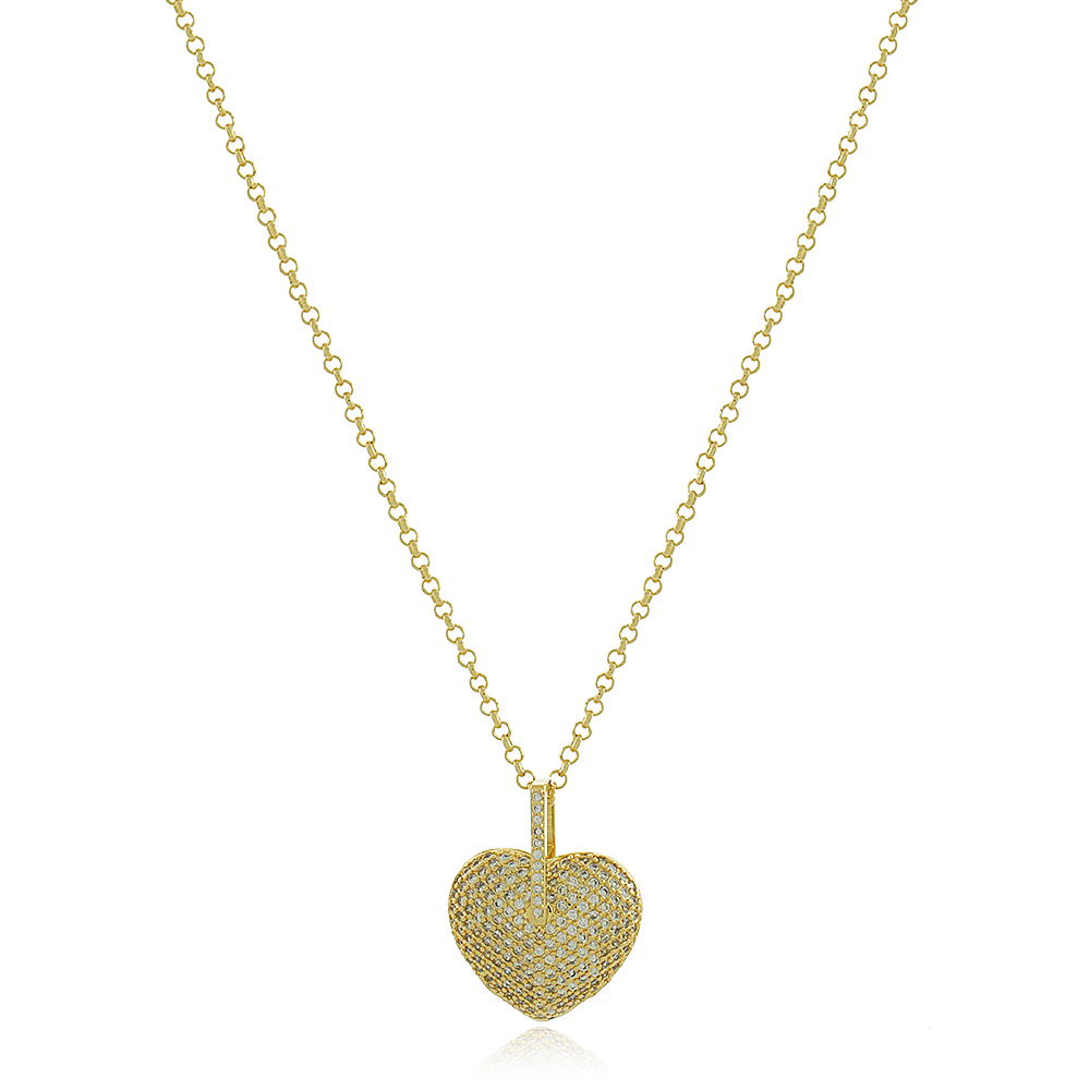 Colar Banhado num Elo Português Fino de 45cm, com um belíssimo Pingente de Coração Bojudo todo Cravejado de Zircônias.