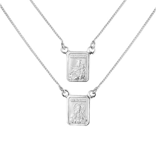 Colar Escapulário de Prata 925 com Nossa Senhora do Carmo e Sagrado Coração de Jesus.