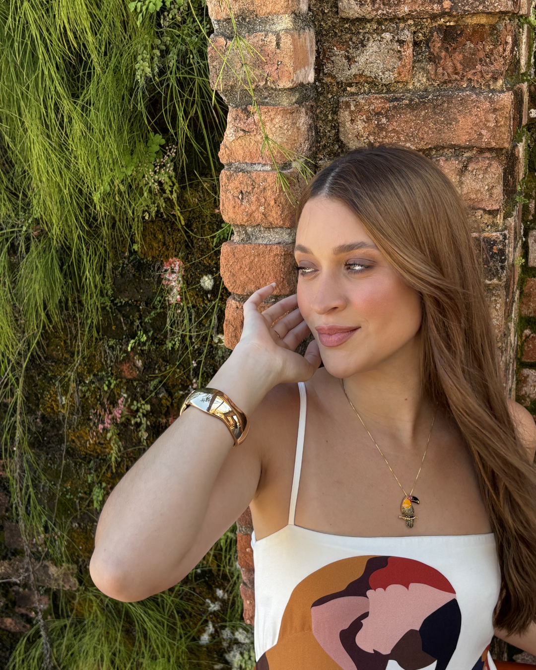O Colar Tucano Araci carrega um significado especial: “Araci”, de origem indígena, remete ao amanhecer e à luz do dia, trazendo à peça uma conexão com renovação, energia e ciclos naturais. Inspirado numa ave que vivia em seu habitat no Jardim Botanico, no Rio de Janeiro, e que partiu, deixando a reflexão sobre a perfeição e intensidade da natureza, mas que é passageira. De alguma forma, ele ficou eternizado.