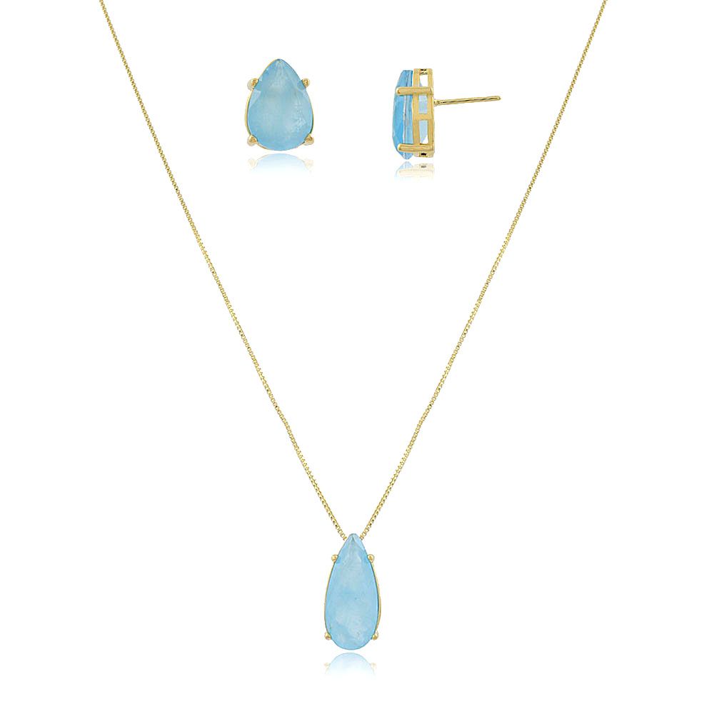 Conjunto Banhado A Ouro 18K, Brincos E Pingente Em Forma De Gota Com Pedra Fusion Azul.