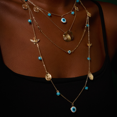 Cordão Banhado Patuá com Pingentes da Sorte: Olho Grego, Espírito Santo, São Bento e cristais azul para além de sorte e proteção, trazer um colorido irreverente ✧✧✧