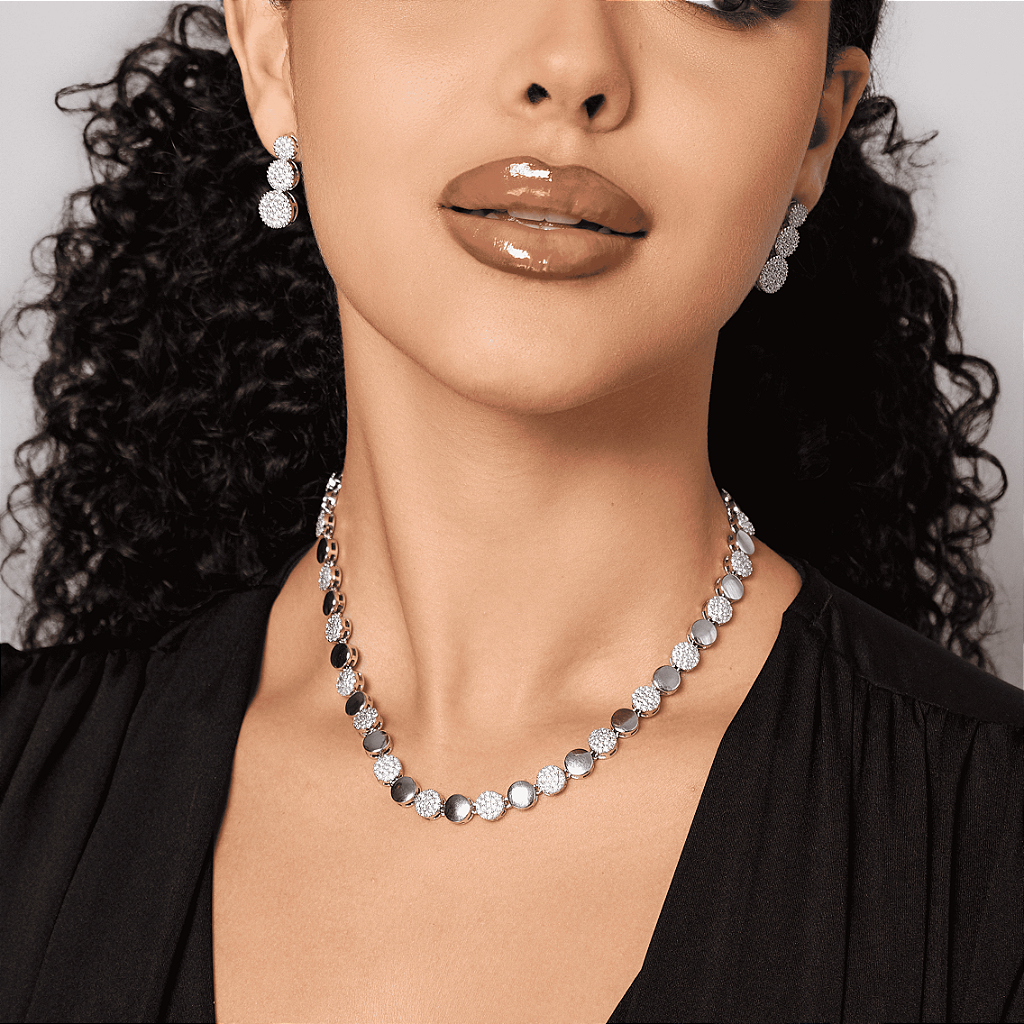 Minimalista e brilhante na medida certa. Esse cordão banhado a ródio branco possui esferas lisas intercaladas com bolas cravejadas de zircônia, criando um visual elegante e versátil. O comprimento de 33,5 cm valoriza o colo com sofisticação discreta.