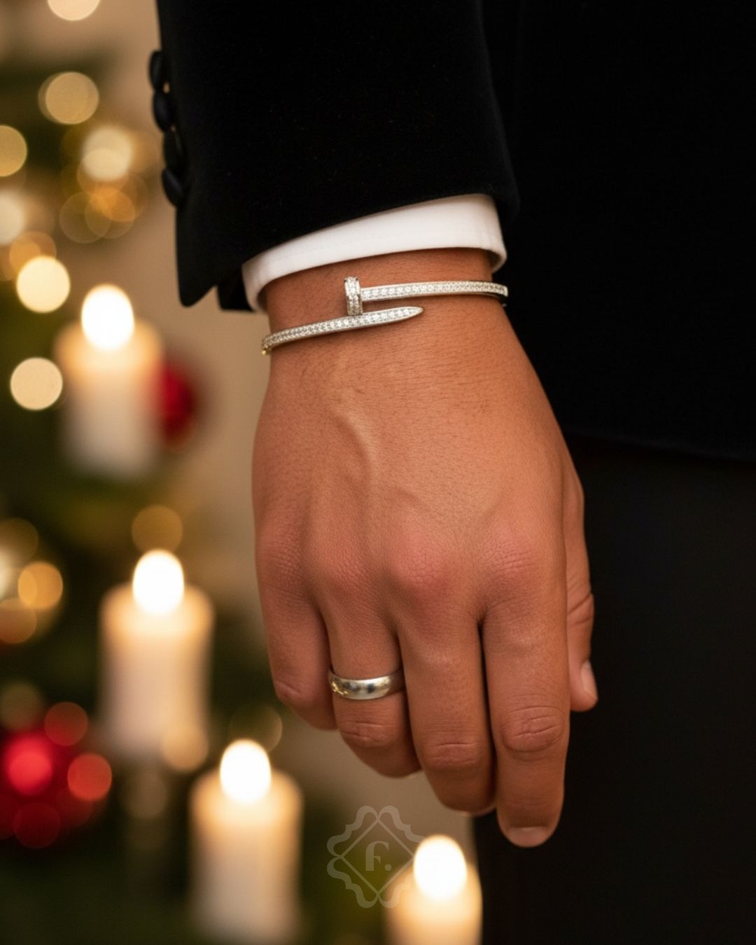 Design marcante e moderno: essa pulseira banhada em ródio branco com camada de prata traz o visual impactante do prego estilizado, cravejado de zircônias. O fecho click garante praticidade e segurança no uso, sem abrir mão da sofisticação.