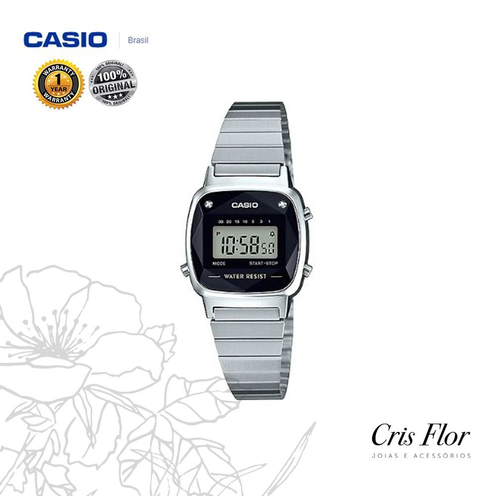 Relógio Casio Diamond Mini Prata Com Fundo Preto, Modelo La670Wad-1Df, Com Diamantes Naturais No Mostrador. Acompanha Certificado De Autenticidade Dos Diamantes Com Um Qr Code Que Leva Ao Site Da Casio Para Explicar A Procedência E Autenticidade Das Pedras.